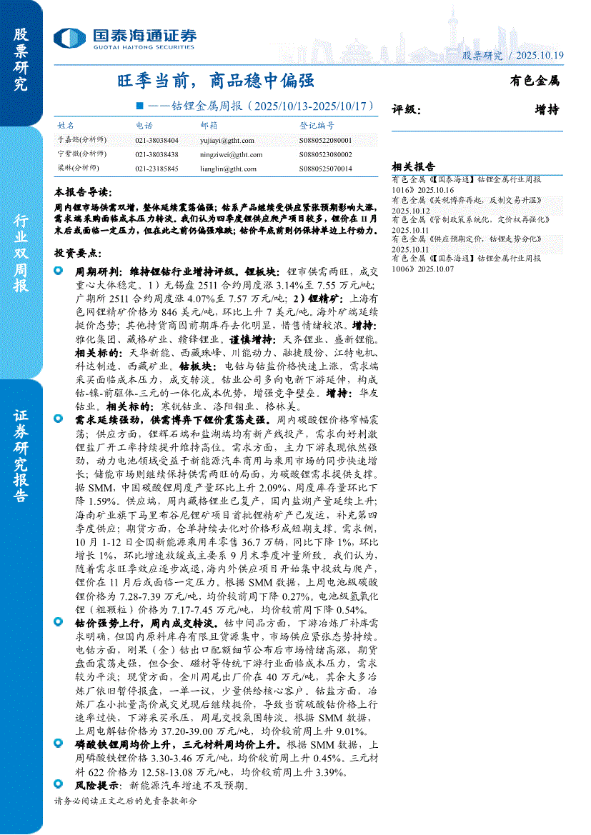 钴锂金属行业:国泰海通证券-钴锂金属行业周报:旺季当前,商品稳中偏强-251019
