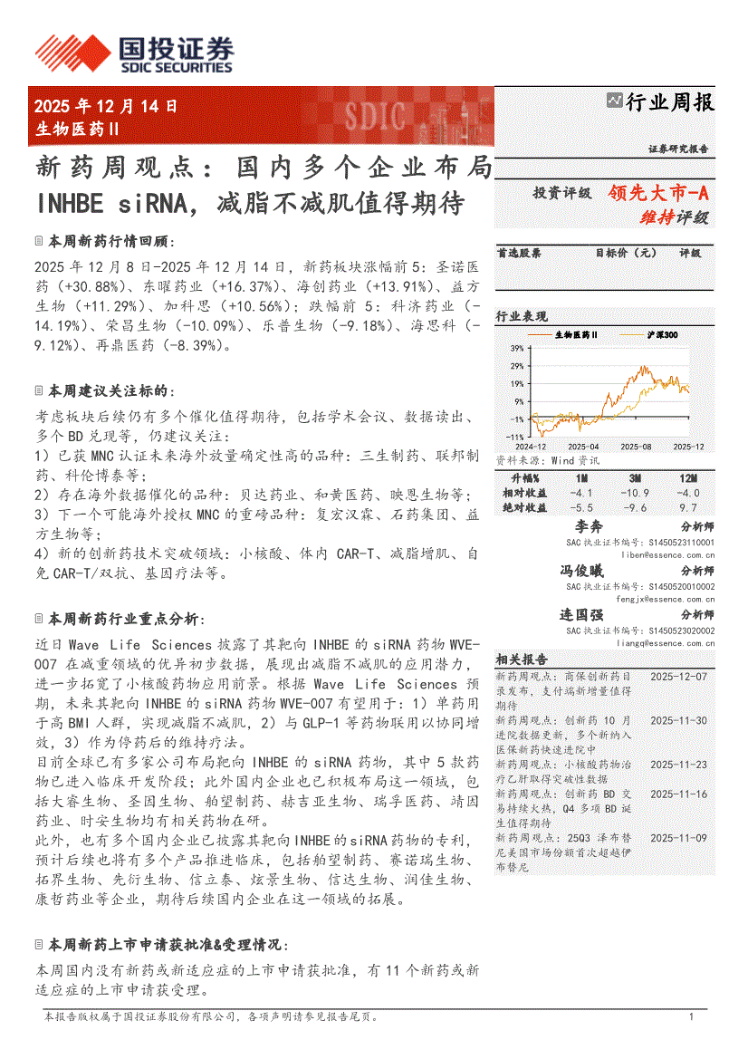 生物医药行业:国投证券-生物医药Ⅱ行业新药周观点:国内多个企业布局INHBE siRNA,减脂不减肌值得期待-251214