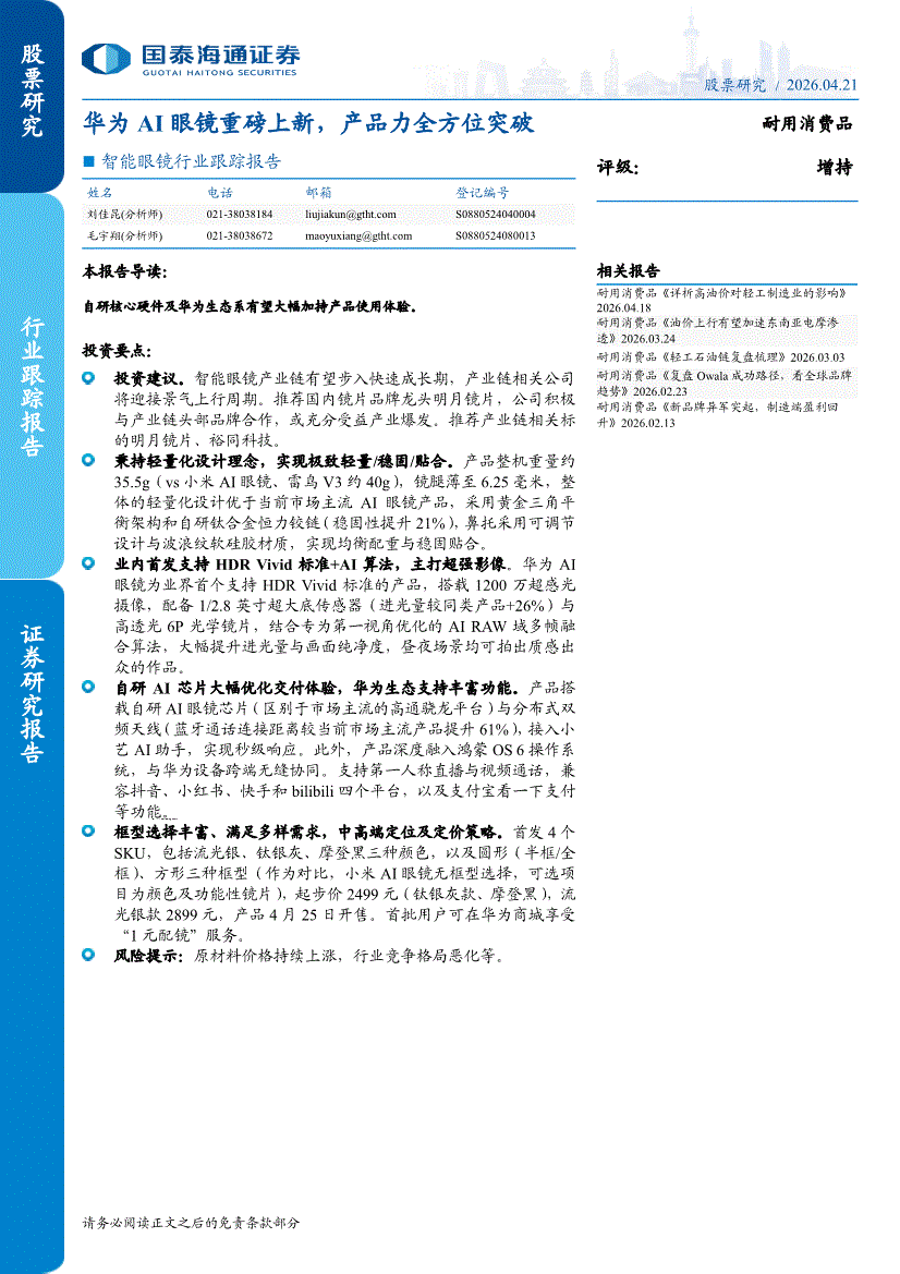 耐用消费品行业:国泰海通证券-智能眼镜行业跟踪报告:华为AI眼镜重磅上新,产品力全方位突破-260421