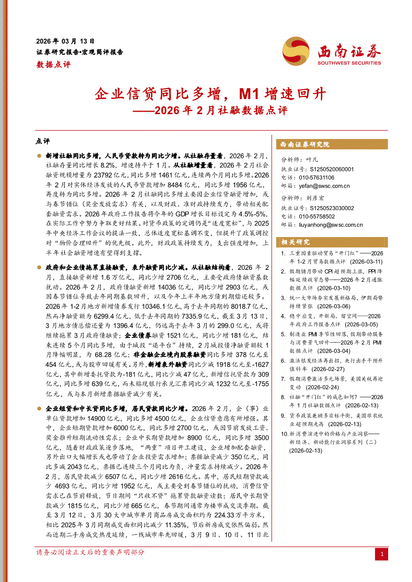 西南证券-2026年2月社融数据点评:企业信贷同比多增,M1增速回升-260313