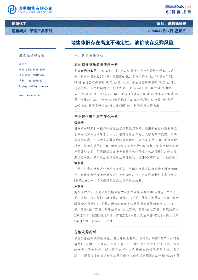 通惠期货-原油、燃料油日报:地缘依旧存在高度不确定性,油价或存反弹风险-251212
