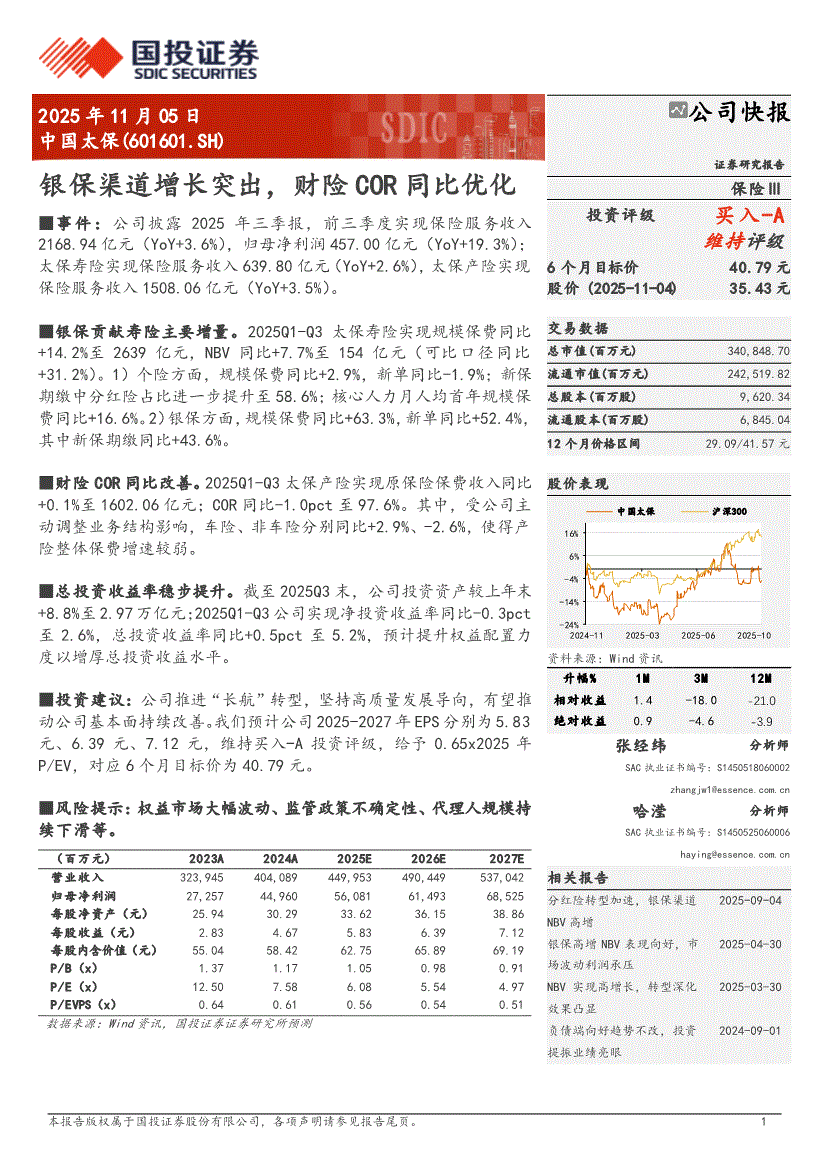 中国太保:国投证券-中国太保-601601-银保渠道增长突出,财险COR同比优化-251105