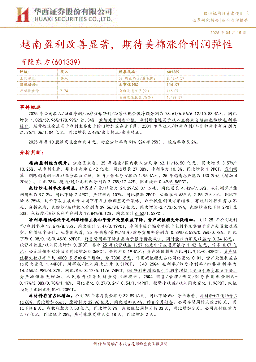 百隆东方:华西证券-百隆东方-601339-越南盈利改善显著,期待美棉涨价利润弹性-260415