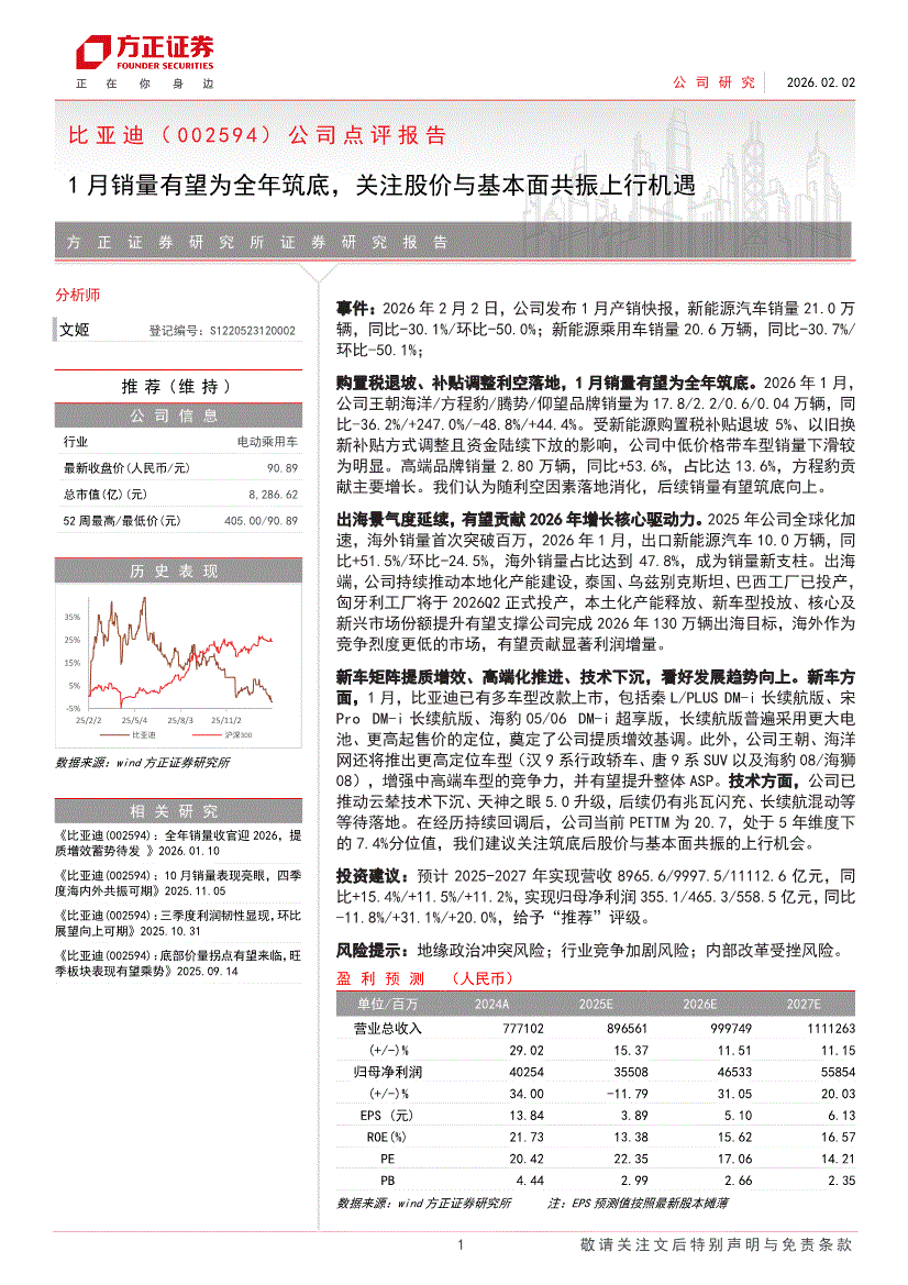 比亚迪:方正证券-比亚迪-002594-公司点评报告:1月销量有望为全年筑底,关注股价与基本面共振上行机遇-260202