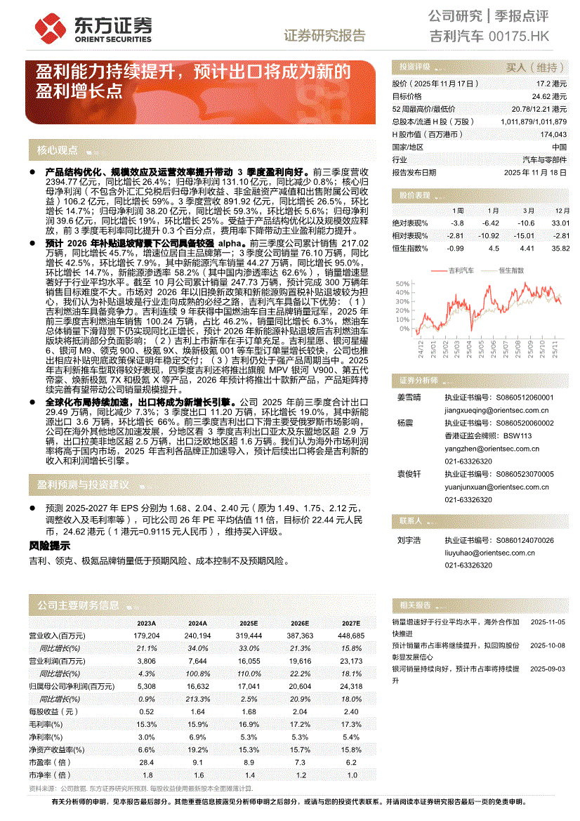 吉利汽车:东方证券-吉利汽车-0175.HK-盈利能力持续提升,预计出口将成为新的盈利增长点-251118