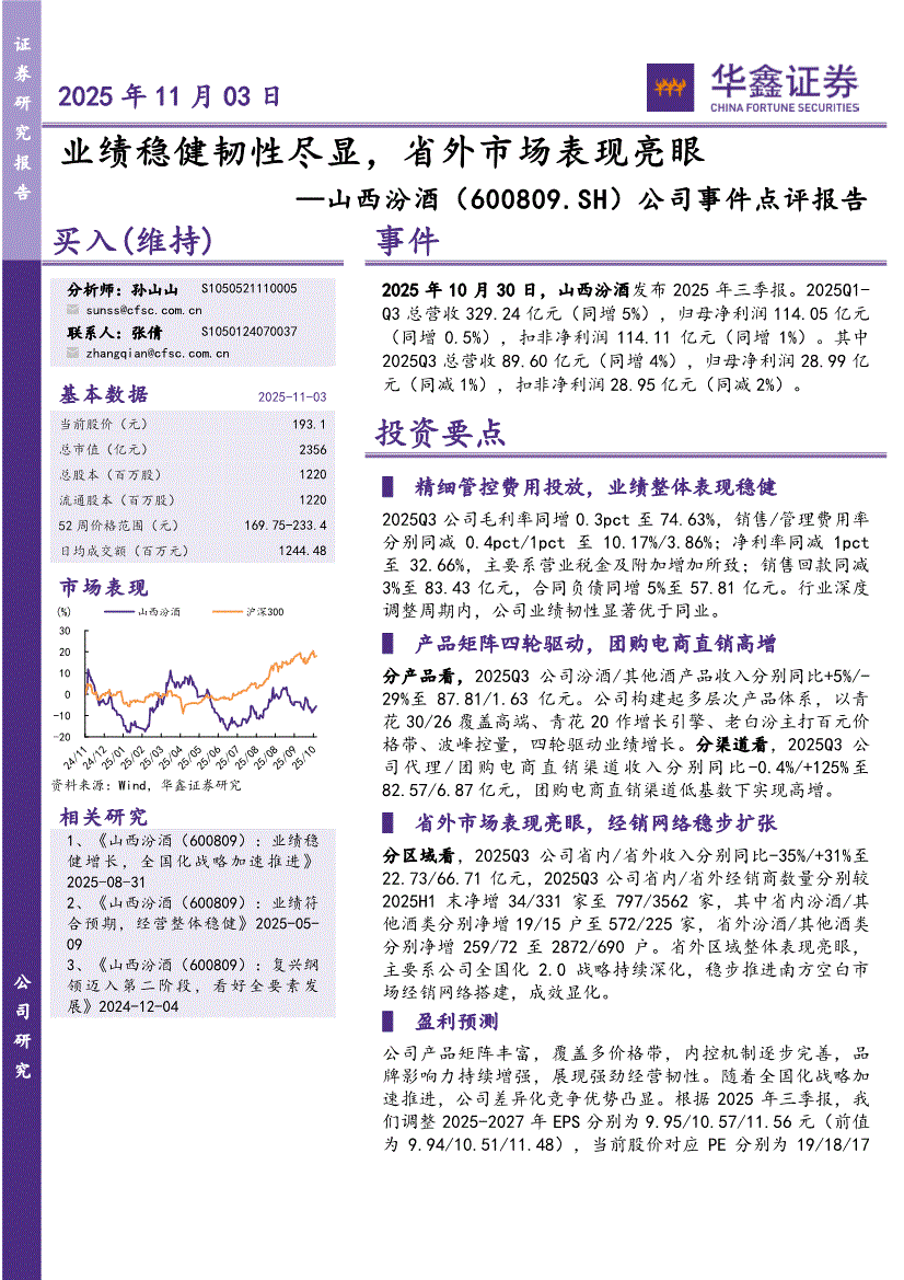 山西汾酒:华鑫证券-山西汾酒-600809-公司事件点评报告:业绩稳健韧性尽显,省外市场表现亮眼-251103