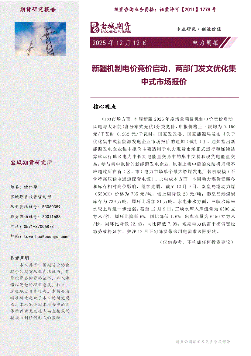宝城期货-电力周报:新疆机制电价竞价启动,两部门发文优化集中式市场报价-251212