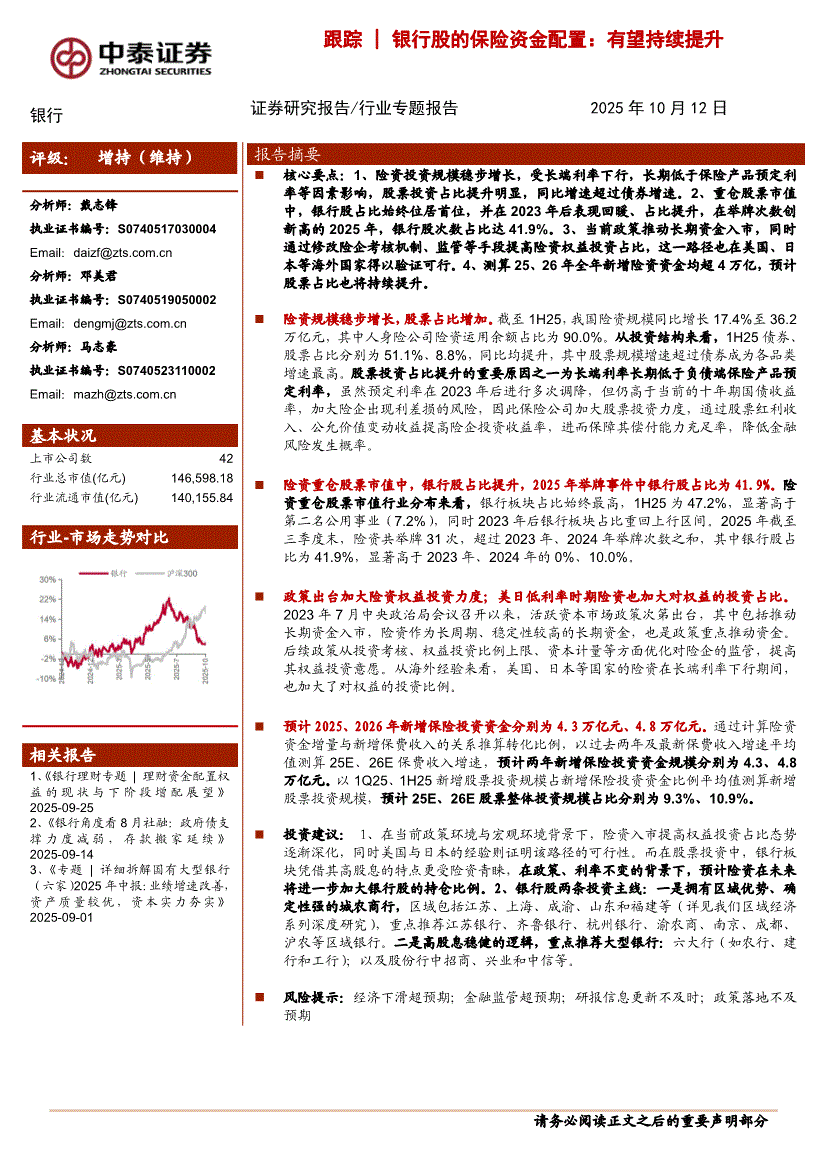 银行业:中泰证券-银行业:跟踪|银行股的保险资金配置,有望持续提升-251012