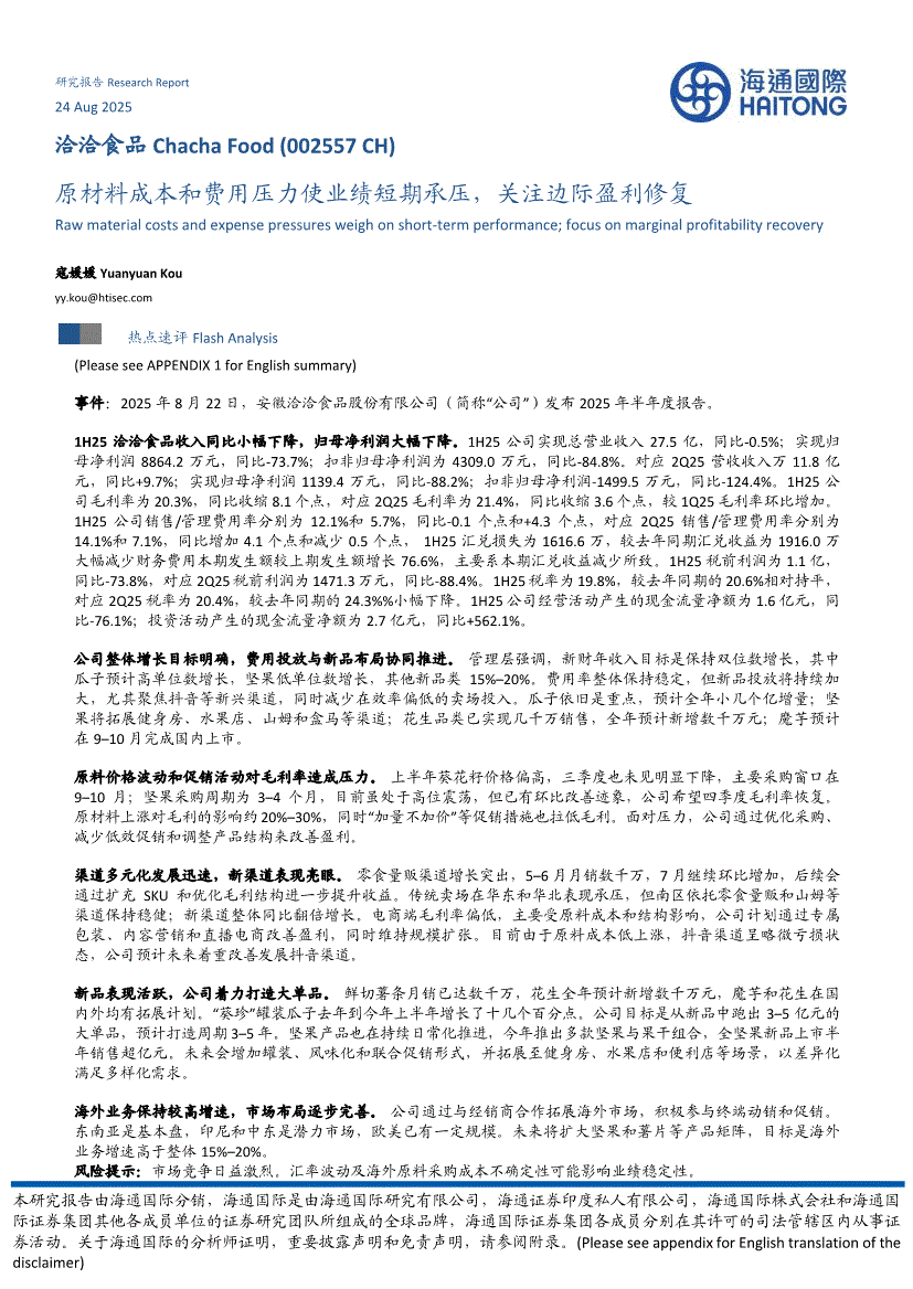 洽洽食品:海通国际-洽洽食品-002557-原材料成本和费用压力使业绩短期承压,关注边际盈利修复-250824
