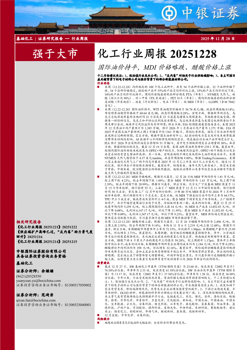 化工行业:中银国际-化工行业周报:国际油价持平,MDI价格略跌、醋酸价格上涨-251228