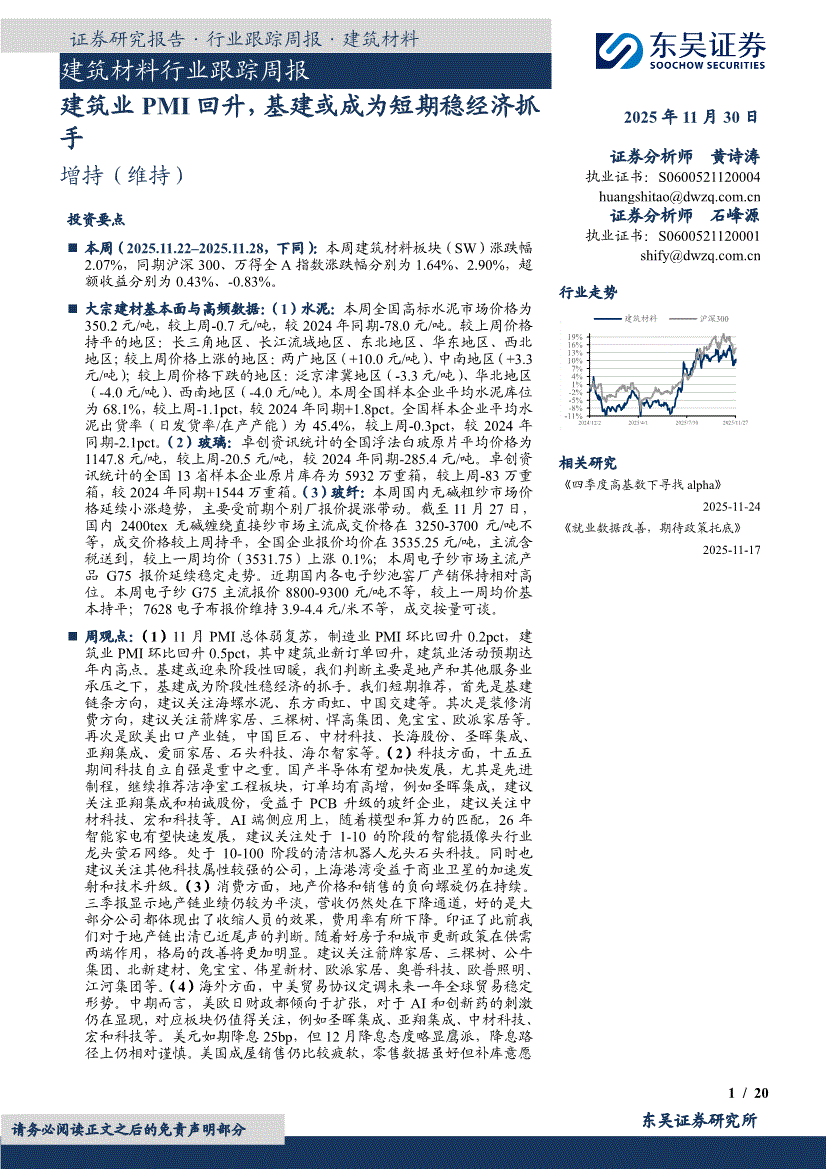 建筑材料行业:东吴证券-建筑材料行业跟踪周报:建筑业PMI回升,基建或成为短期稳经济抓手-251130
