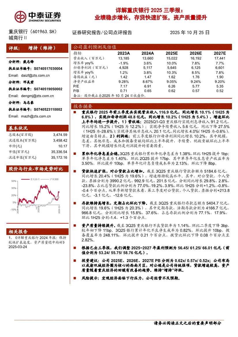 重庆银行:中泰证券-重庆银行-601963-详解重庆银行2025三季报:业绩稳步增长,存贷快速扩张,资产质量提升-251025