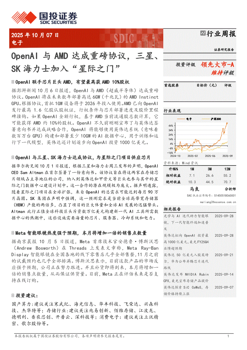 电子行业:国投证券-电子行业周报:OpenAI与AMD达成重磅协议,三星、SK海力士加入“星际之门”-251007
