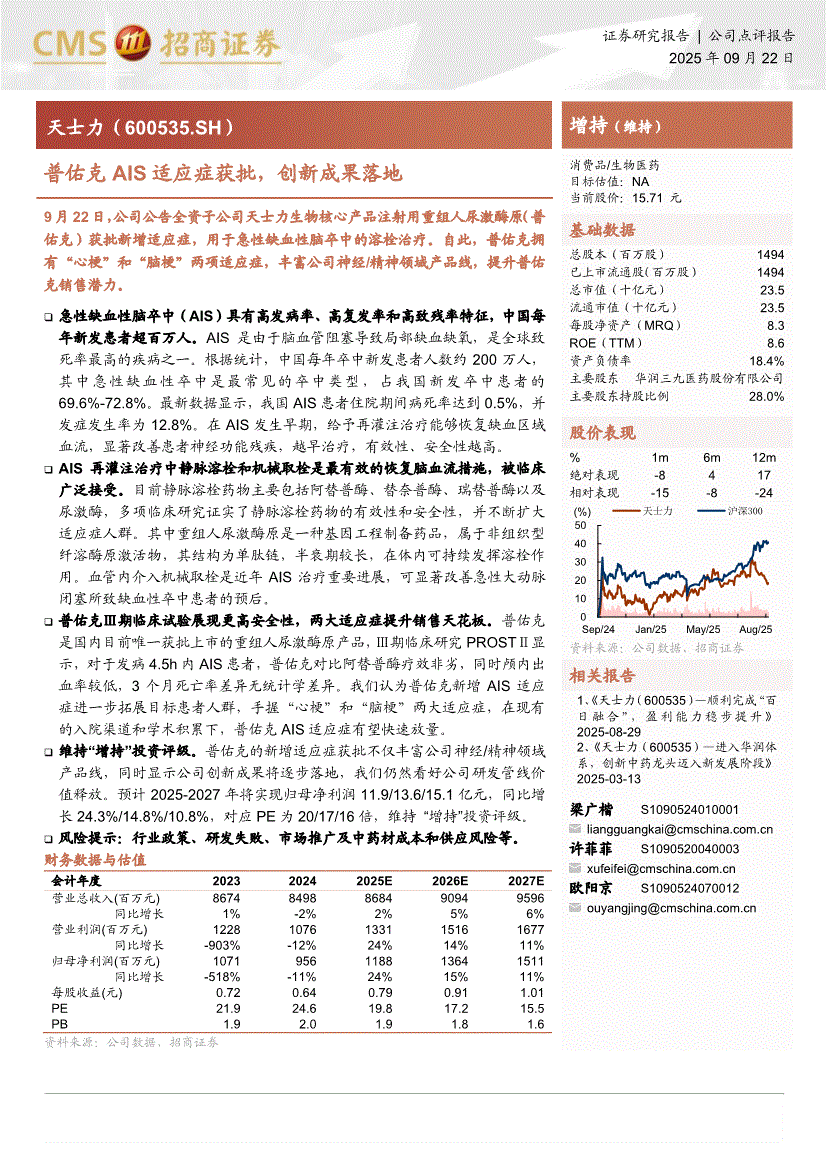天士力:招商证券-天士力-600535-普佑克AIS适应症获批,创新成果落地-250922