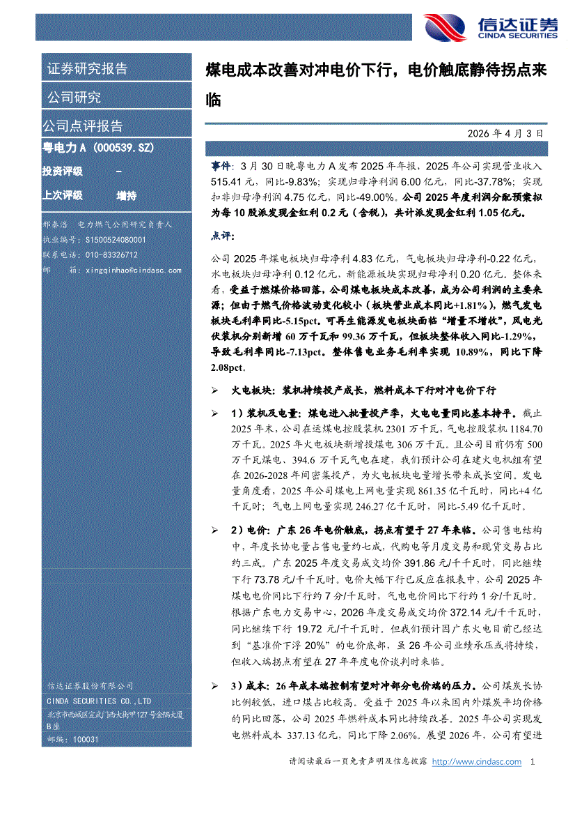 粤电力A:信达证券-粤电力A-000539-煤电成本改善对冲电价下行,电价触底静待拐点来临-260403