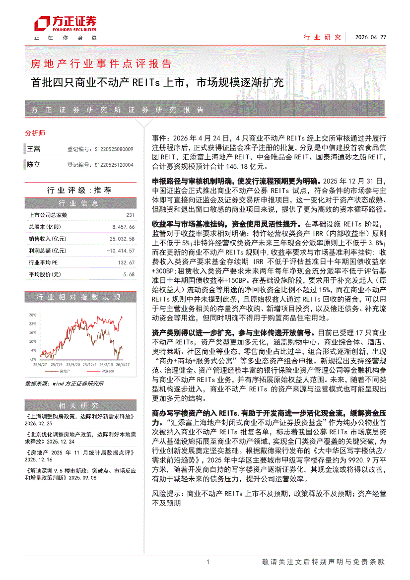 房地产行业:方正证券-房地产行业事件点评报告:首批四只商业不动产REITs上市,市场规模逐渐扩充-260427