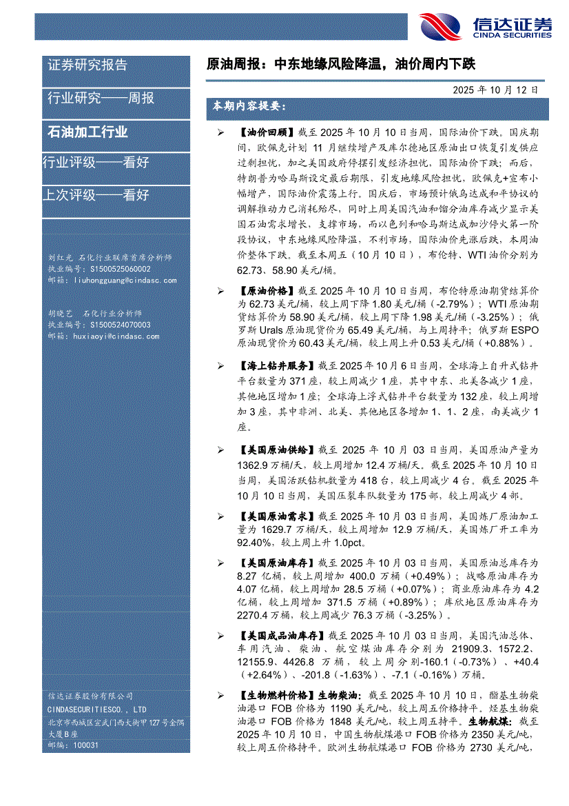 石油加工行业:信达证券-石油加工行业原油周报:中东地缘风险降温,油价周内下跌-251012