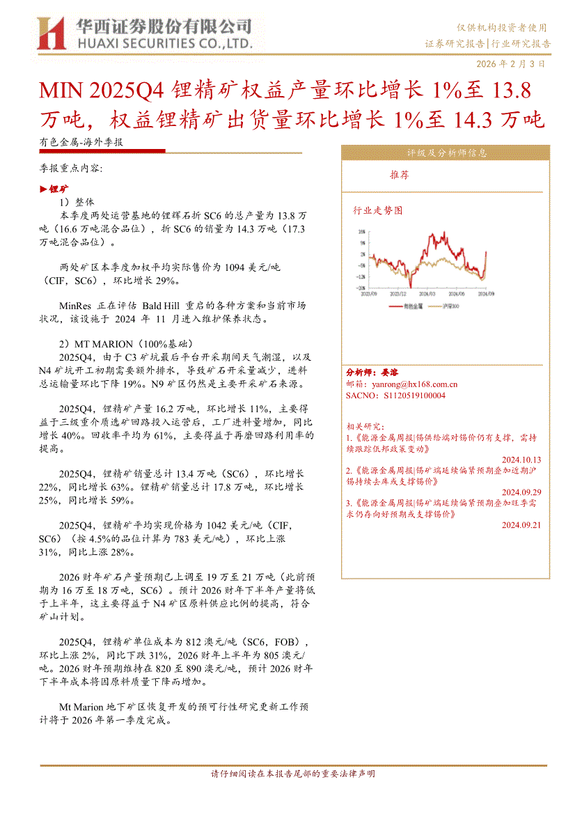 有色金属行业:华西证券-有色金属行业~海外季报:MIN 2025Q4锂精矿权益产量环比增长1%至13.8万吨,权益锂精矿出货量环比增长1%至14.3万吨-260203