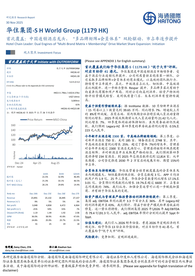 华住集团~S:海通国际-华住集团~S-1179.HK-首次覆盖:中国连锁酒店龙头,“多品牌矩阵+会员体系”双轮驱动,市占率逐步提升-251130