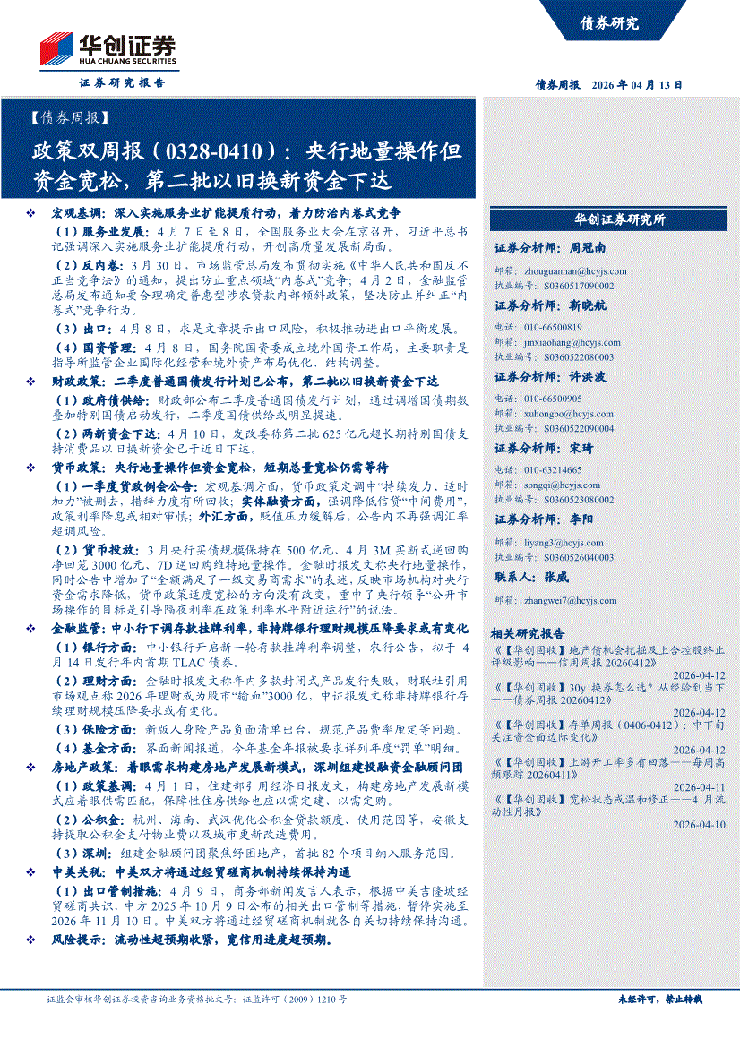 华创证券-【债券周报】政策双周报(0328~0410):央行地量操作但资金宽松,第二批以旧换新资金下达-260413