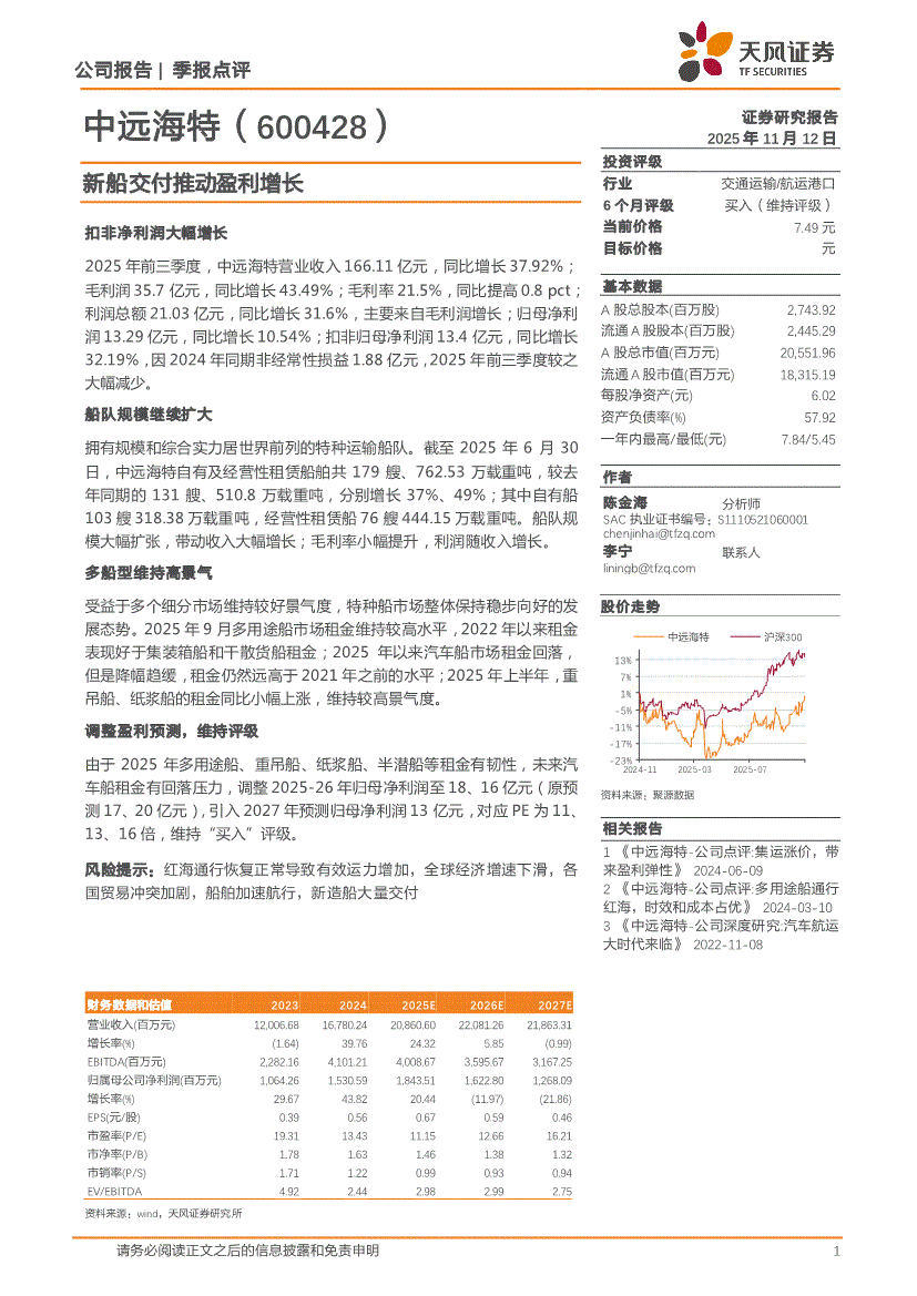 中远海特:天风证券-中远海特-600428-新船交付推动盈利增长-251112