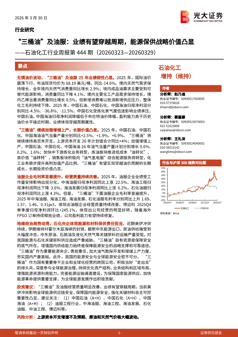 石油化工行业:光大证券-石油化工行业周报第444期:“三桶油”及油服,业绩有望穿越周期,能源保供战略价值凸显-260330