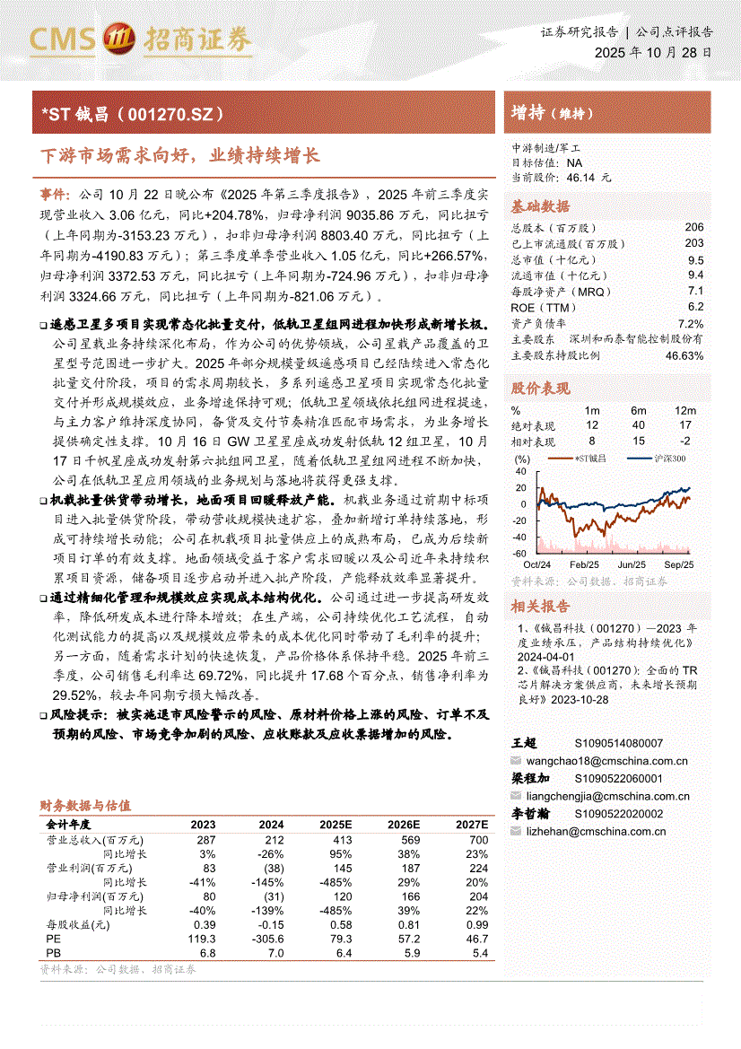 *ST铖昌:招商证券-*ST铖昌-001270-下游市场需求向好,业绩持续增长-251028