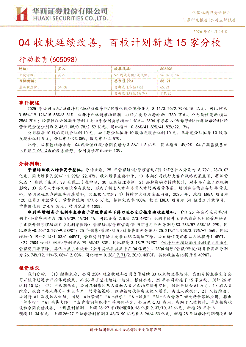 华西证券-行动教育-605098-Q4收款延续改善,百校计划新建15家分校-260414