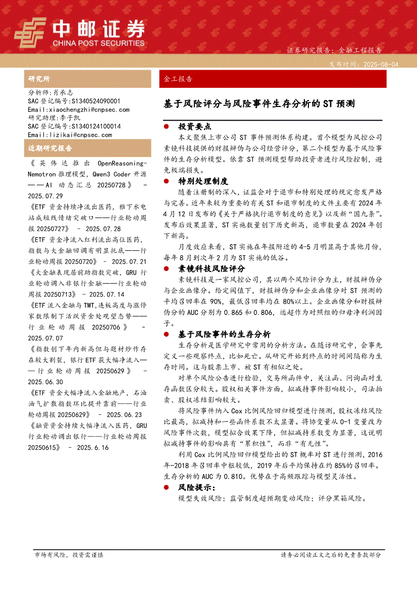 中邮证券-金工报告:基于风险评分与风险事件生存分析的ST预测-250804