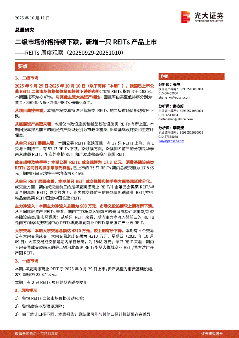 光大证券-REITs周度观察:二级市场价格持续下跌,新增一只REITs产品上市-251011