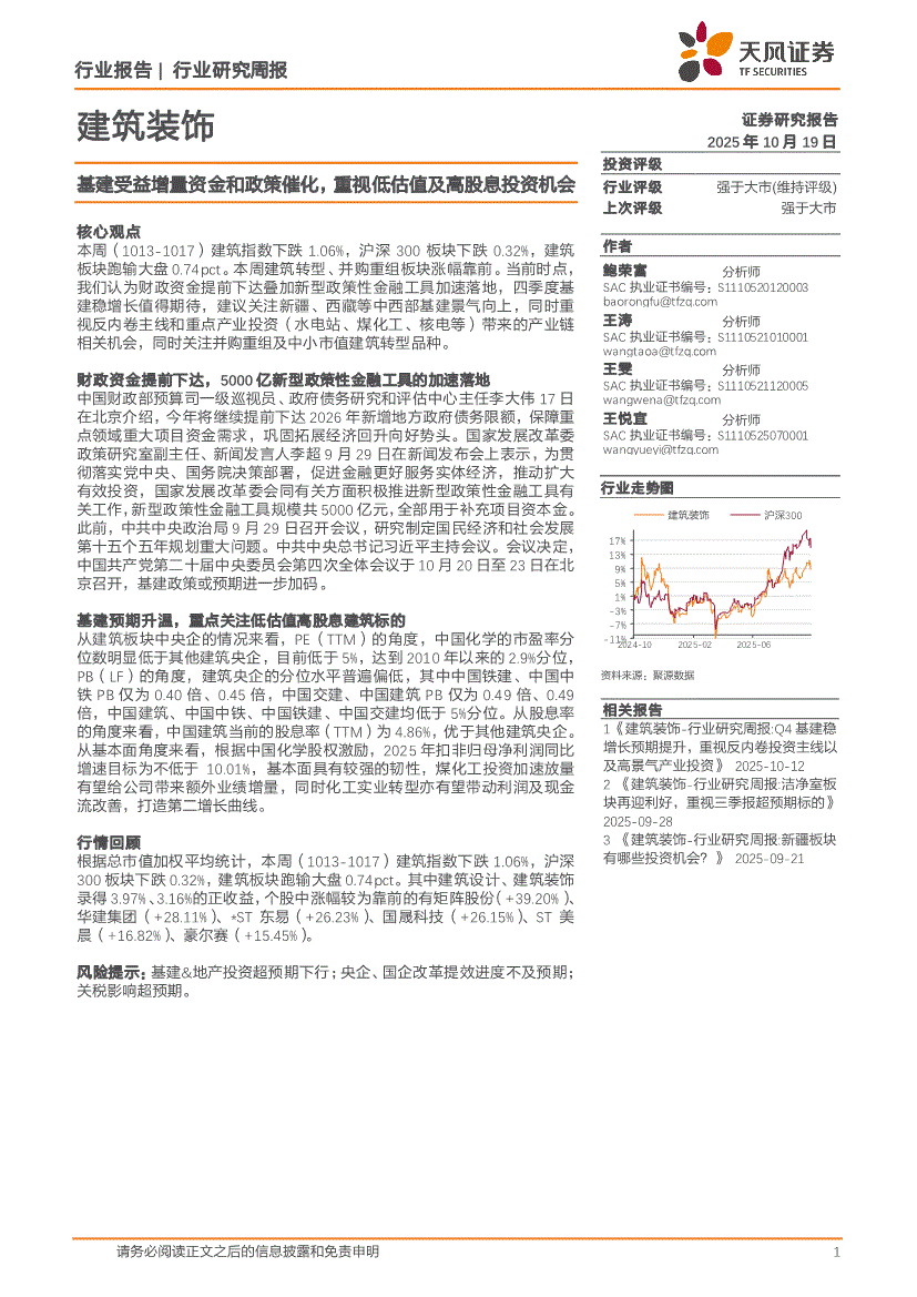 建筑装饰行业:天风证券-建筑装饰行业研究周报:基建受益增量资金和政策催化,重视低估值及高股息投资机会-251019