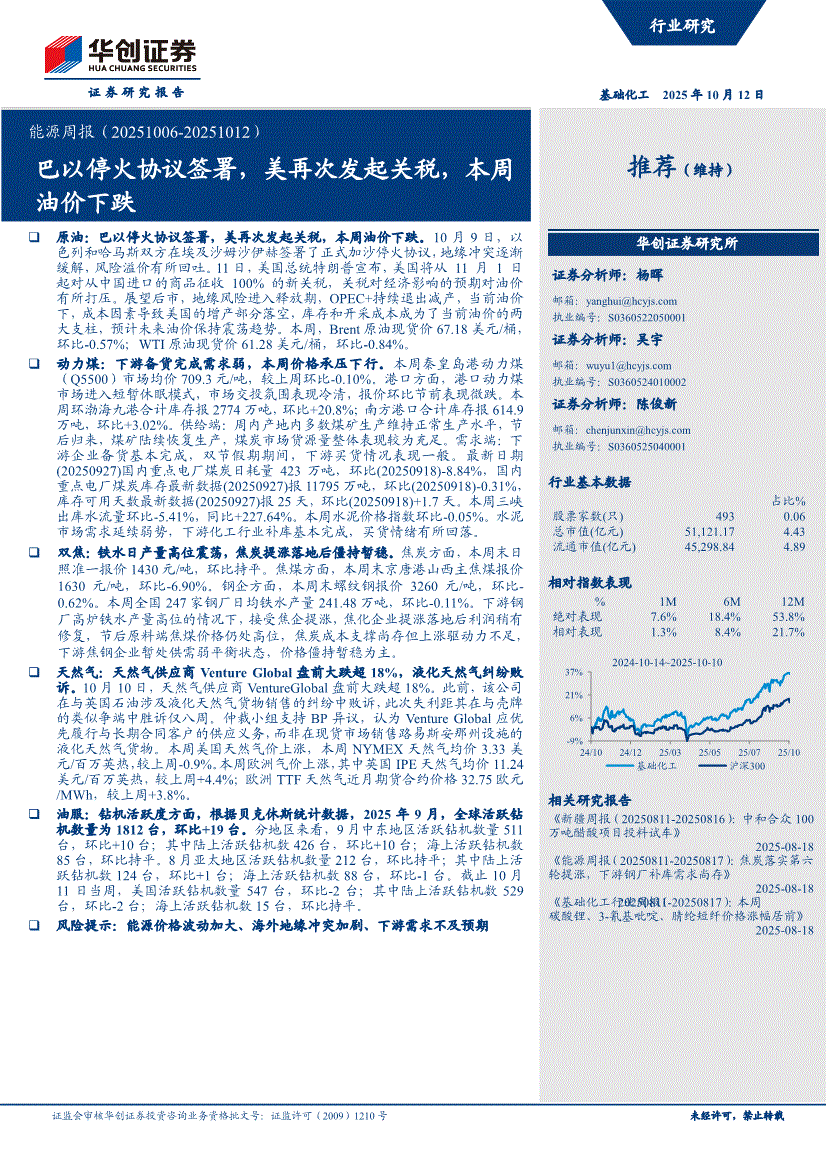 基础化工行业:华创证券-基础化工行业能源周报:巴以停火协议签署,美再次发起关税,本周油价下跌-251012