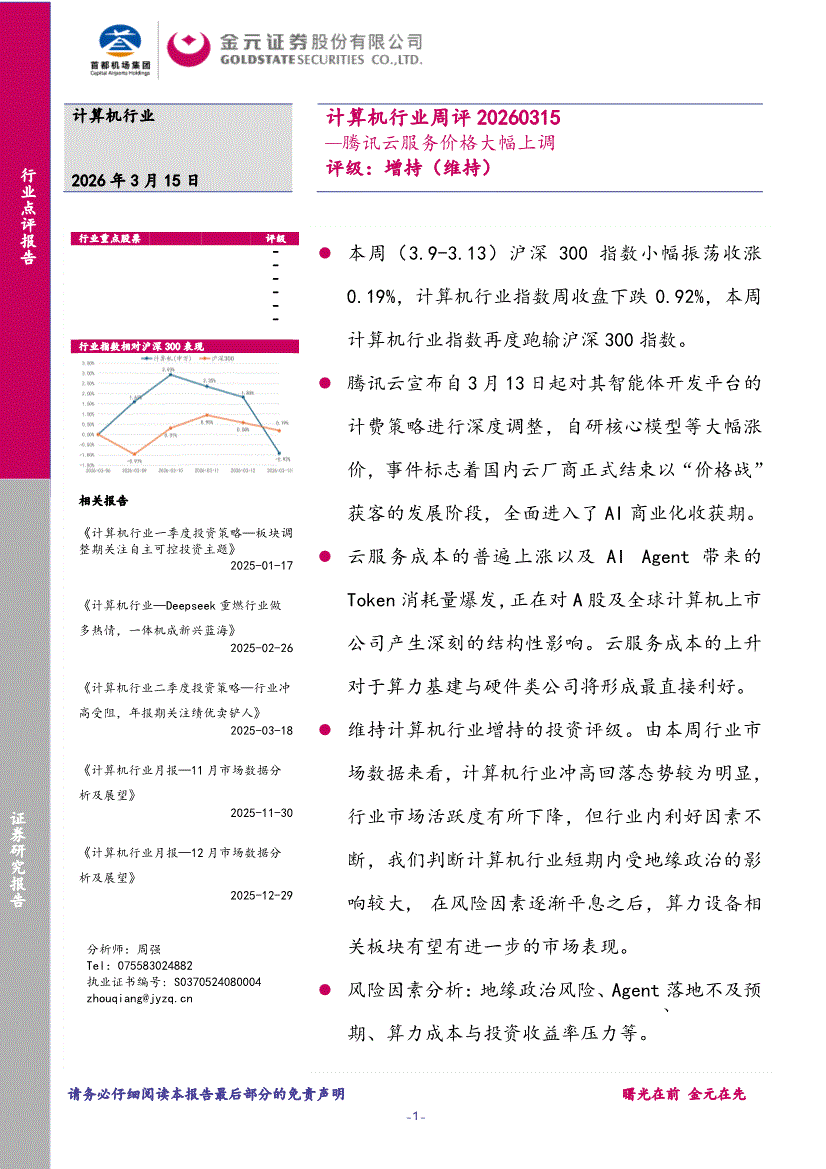 计算机行业:金元证券-计算机行业周评:腾讯云服务价格大幅上调-260315
