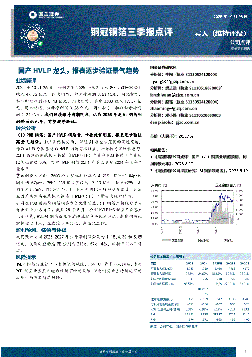 铜冠铜箔:国金证券-铜冠铜箔-301217-三季报点评:国产HVLP龙头,报表逐步验证景气趋势-251026