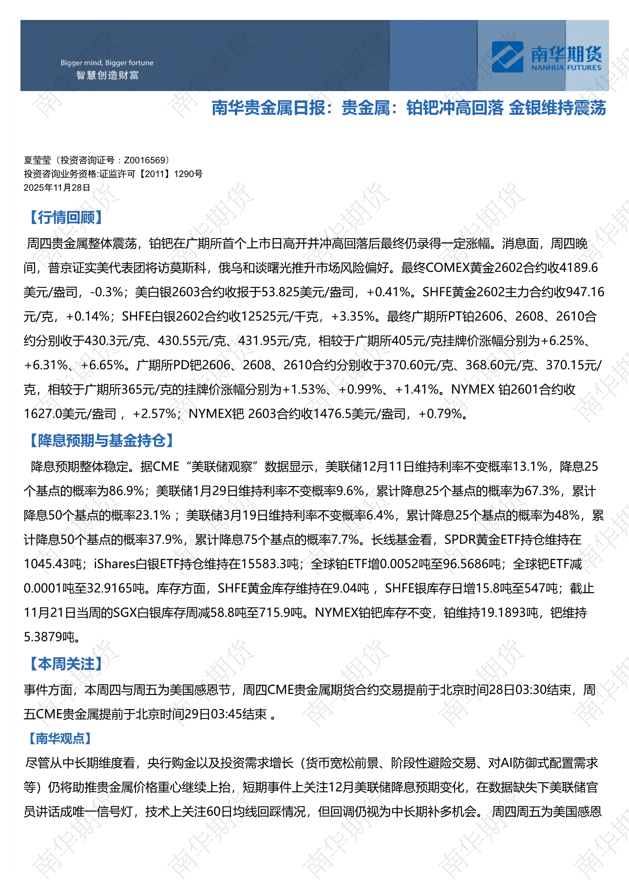 南华期货-贵金属日报:贵金属,铂钯冲高回落,金银维持震荡-251128