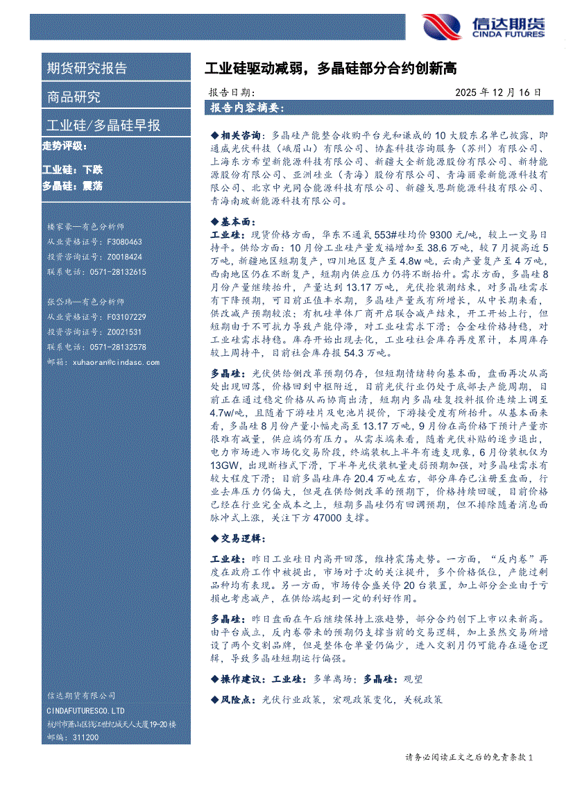 信达期货-工业硅/多晶硅早报:工业硅驱动减弱,多晶硅部分合约创新高-251216