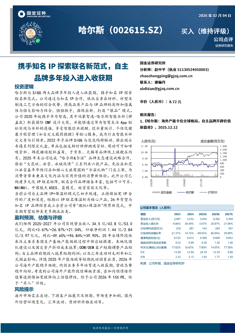 哈尔斯:国金证券-哈尔斯-002615-携手知名IP探索联名新范式,自主品牌多年投入进入收获期-260204