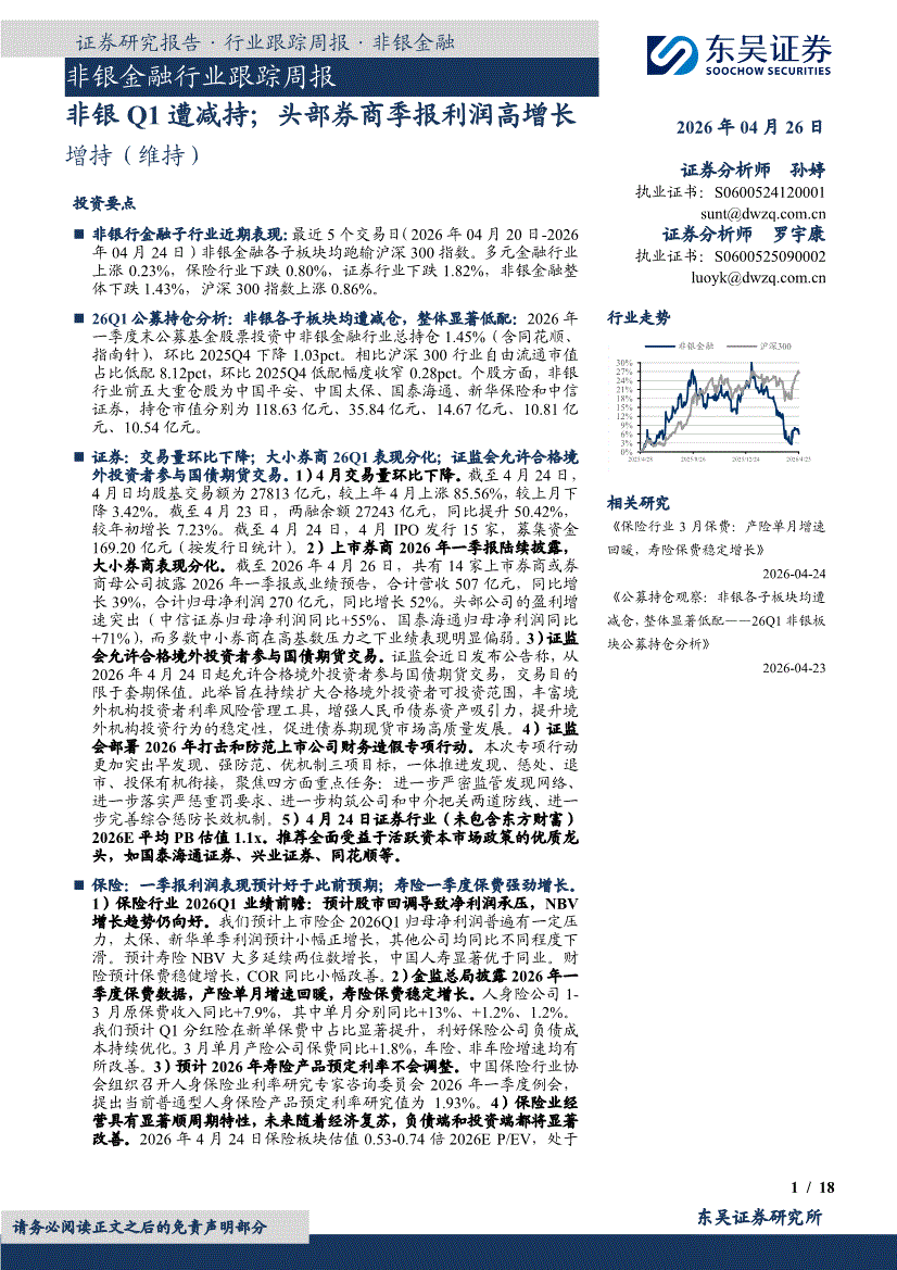 非银金融行业:东吴证券-非银金融行业跟踪周报:非银Q1遭减持;头部券商季报利润高增长-260426