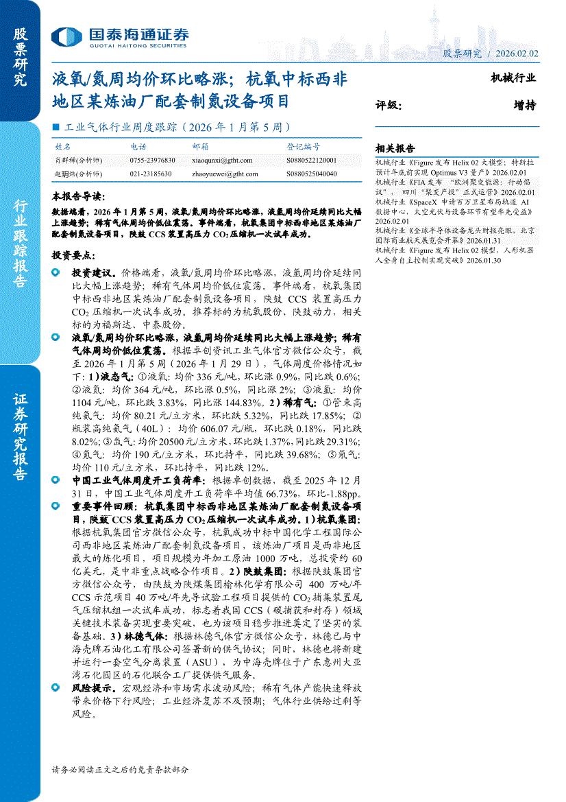 工业气体行业:国泰海通证券-工业气体行业周度跟踪(2026年1月第5周):液氧/氮周均价环比略涨;杭氧中标西非地区某炼油厂配套制氮设备项目-260202