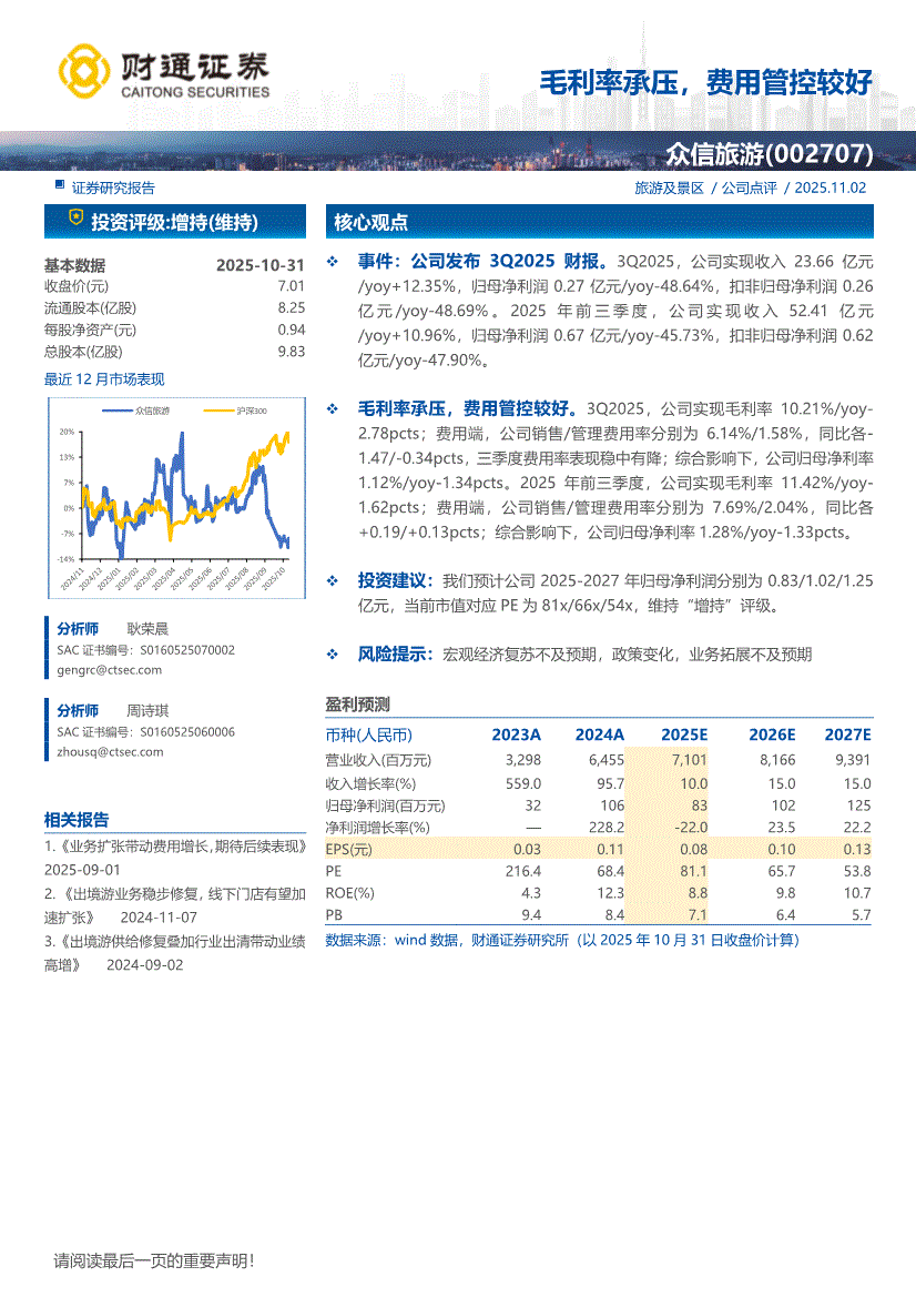 众信旅游:财通证券-众信旅游-002707-毛利率承压,费用管控较好-251102
