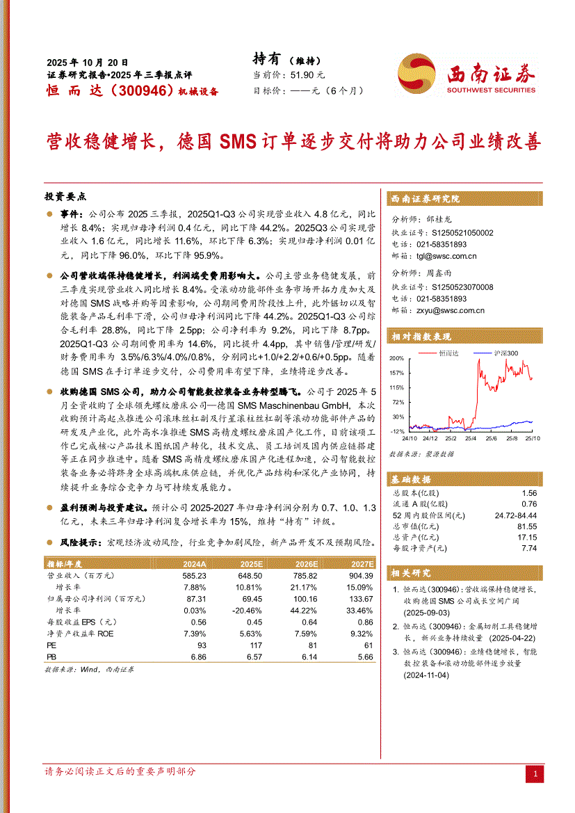 恒而达:西南证券-恒而达-300946-营收稳健增长,德国SMS订单逐步交付将助力公司业绩改善-251020