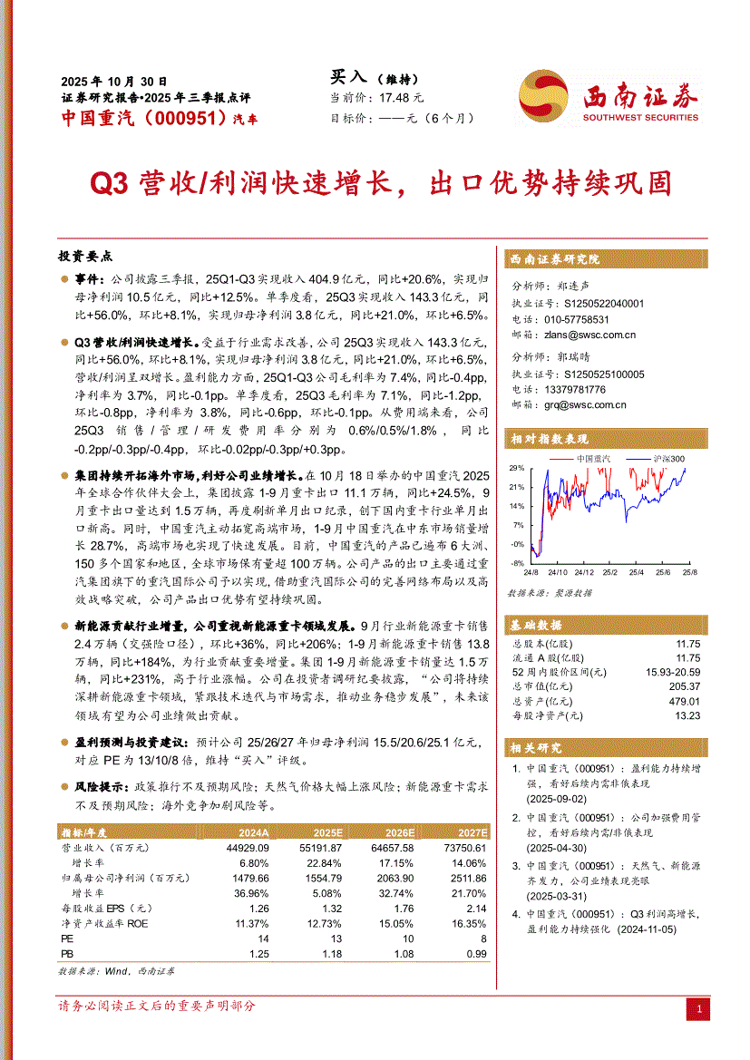 中国重汽:西南证券-中国重汽-000951-Q3营收利润快速增长,出口优势持续巩固-251030