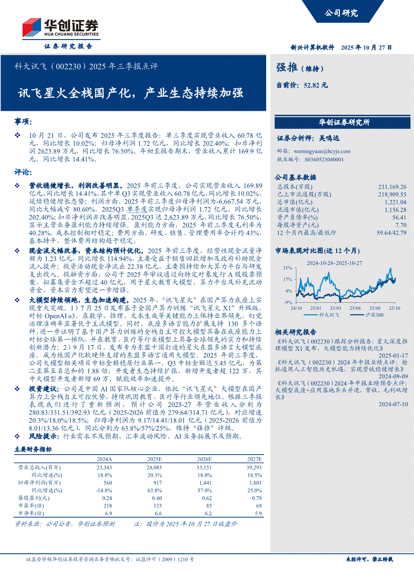 科大讯飞:华创证券-科大讯飞-002230-2025年三季报点评:讯飞星火全栈国产化,产业生态持续加强-251027