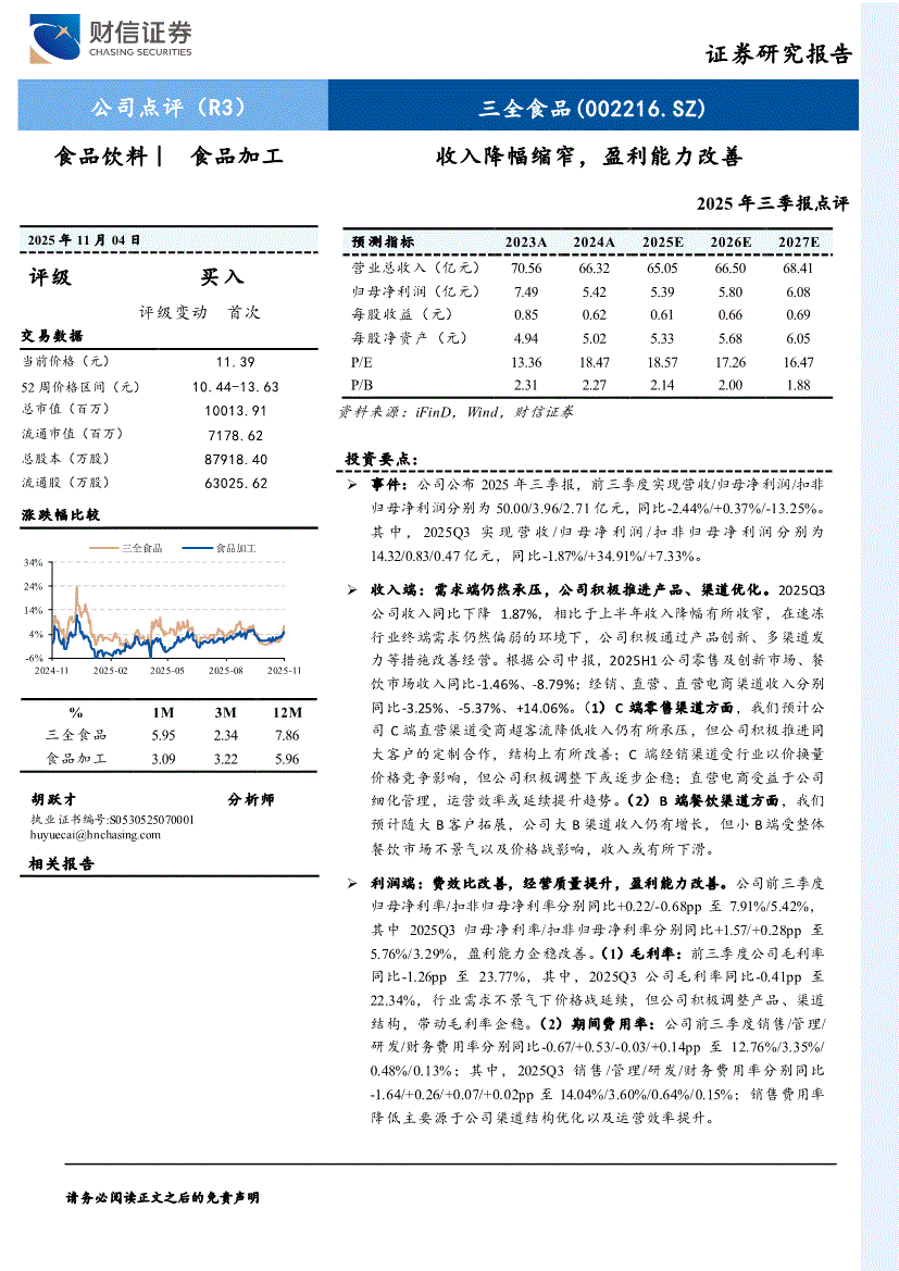 三全食品:财信证券-三全食品-002216-2025年三季报点评:收入降幅缩窄,盈利能力改善-251104