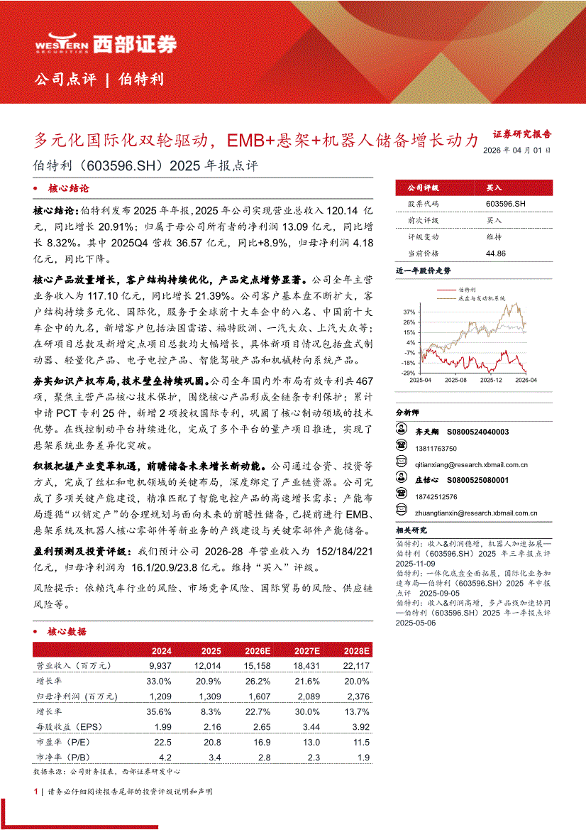 伯特利:西部证券-伯特利-603596-2025年报点评:多元化国际化双轮驱动,EMB+悬架+机器人储备增长动力-260401