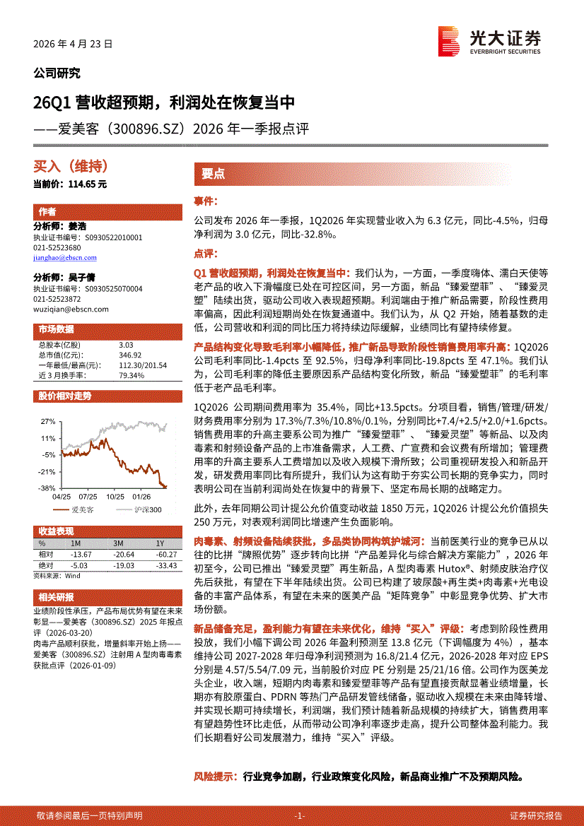 爱美客:光大证券-爱美客-300896-2026年一季报点评:26Q1营收超预期,利润处在恢复当中-260423