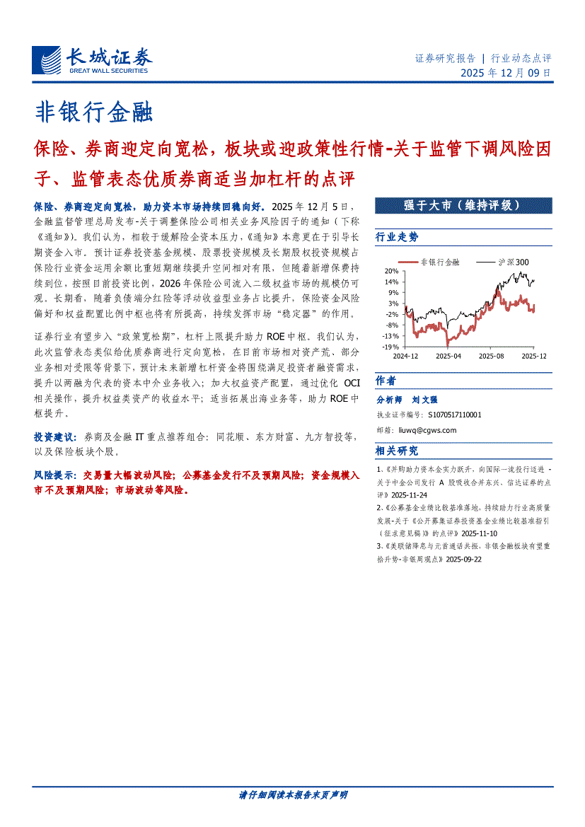 非银行金融行业:长城证券-非银行金融行业:保险、券商迎定向宽松,板块或迎政策性行情~关于监管下调风险因子、监管表态优质券商适当加杠杆的点评-251209