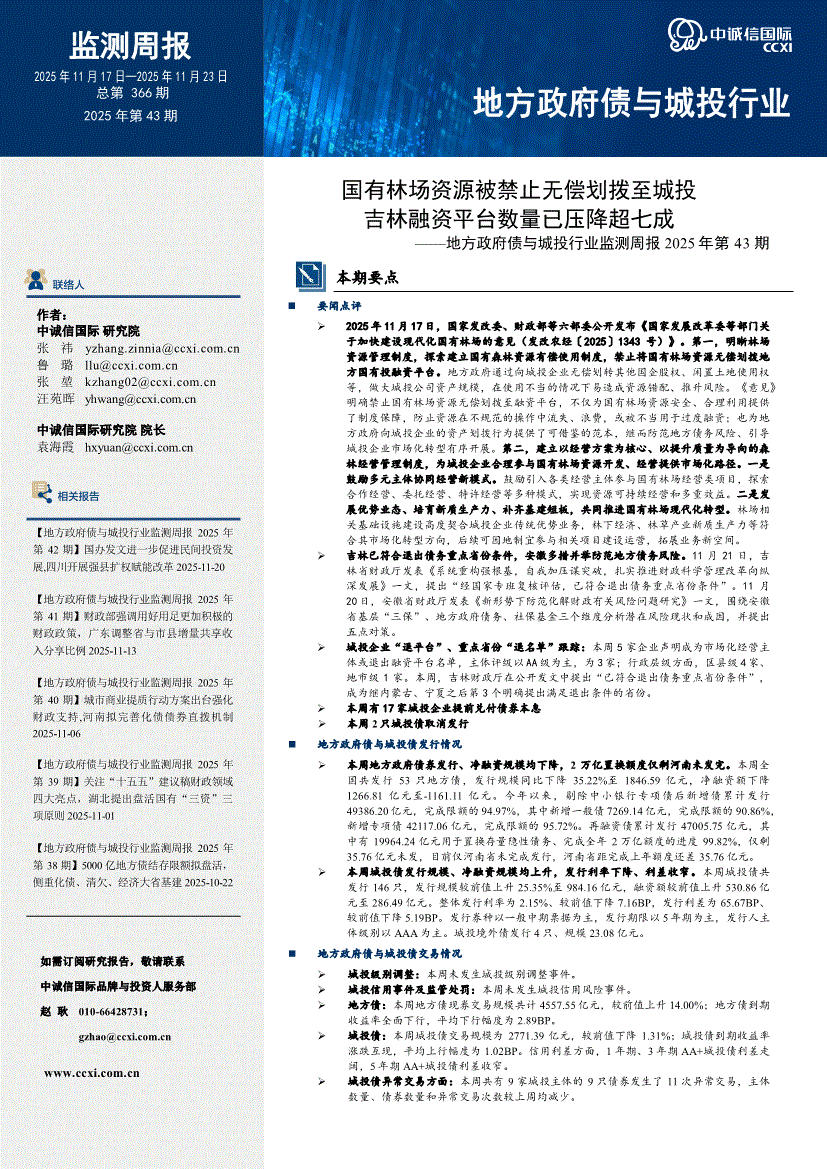 中诚信国际-地方政府债与城投行业监测周报2025年第43期:国有林场资源被禁止无偿划拨至城投,吉林融资平台数量已压降超七成-251123