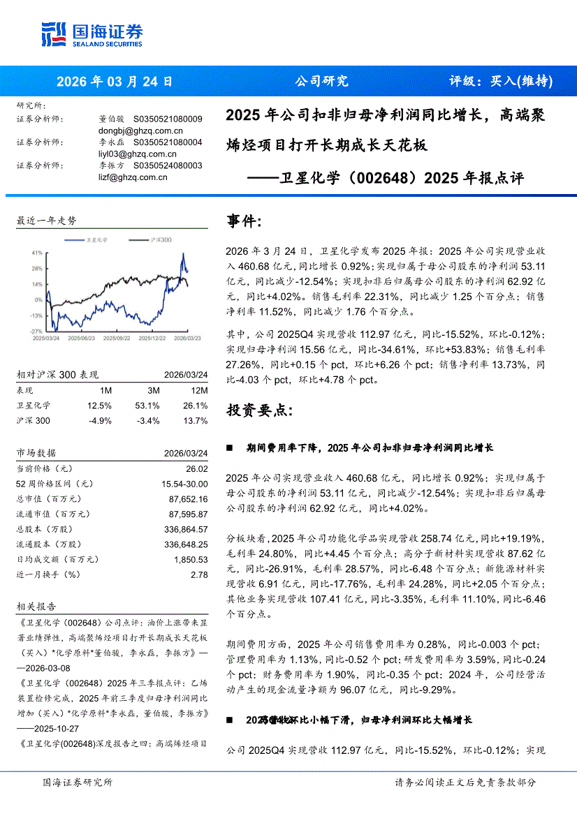 卫星化学:国海证券-卫星化学-002648-2025年报点评:2025年公司扣非归母净利润同比增长,高端聚烯烃项目打开长期成长天花板-260324