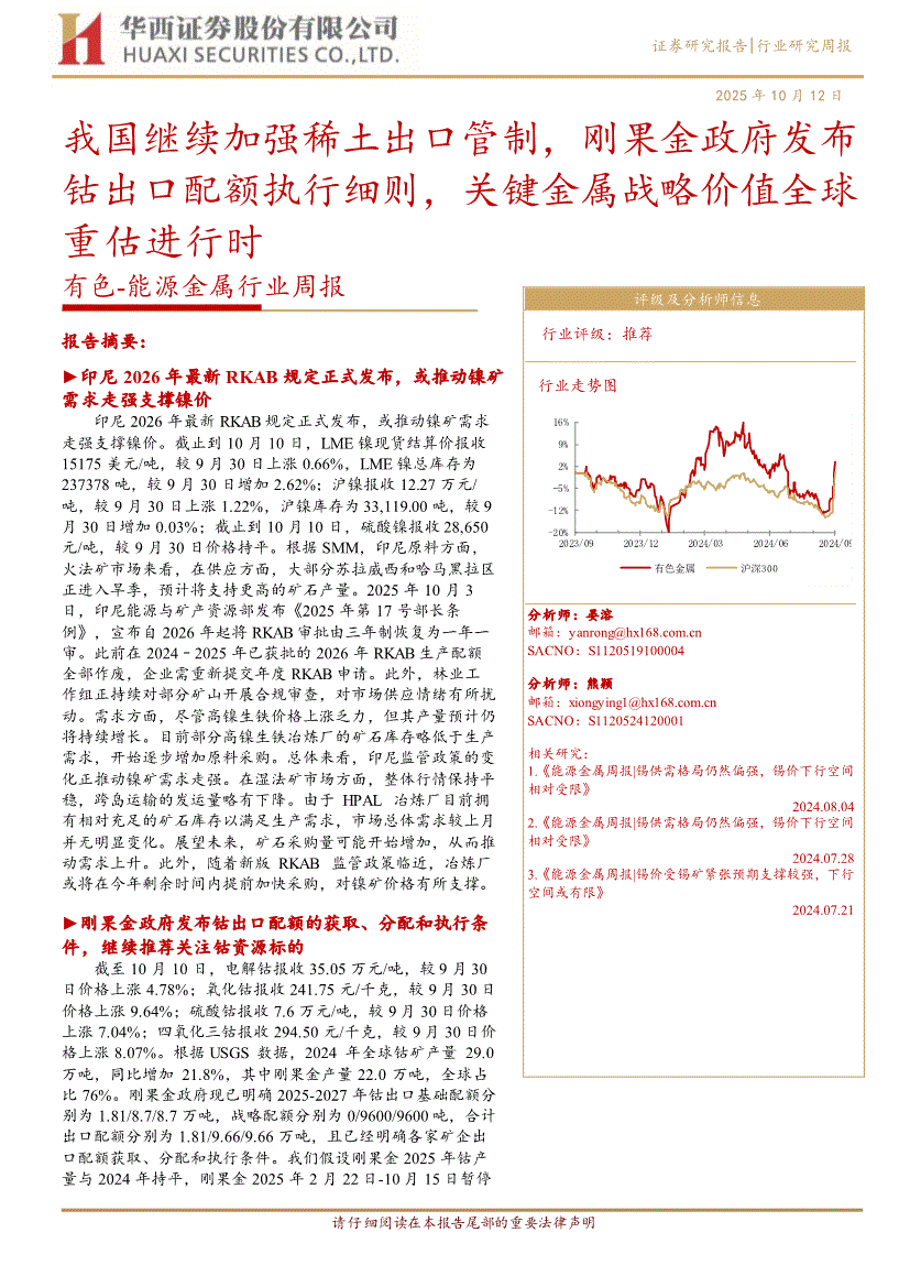 有色~能源金属行业:华西证券-有色~能源金属行业周报:我国继续加强稀土出口管制,刚果金政府发布钴出口配额执行细则,关键金属战略价值全球重估进行时-251012